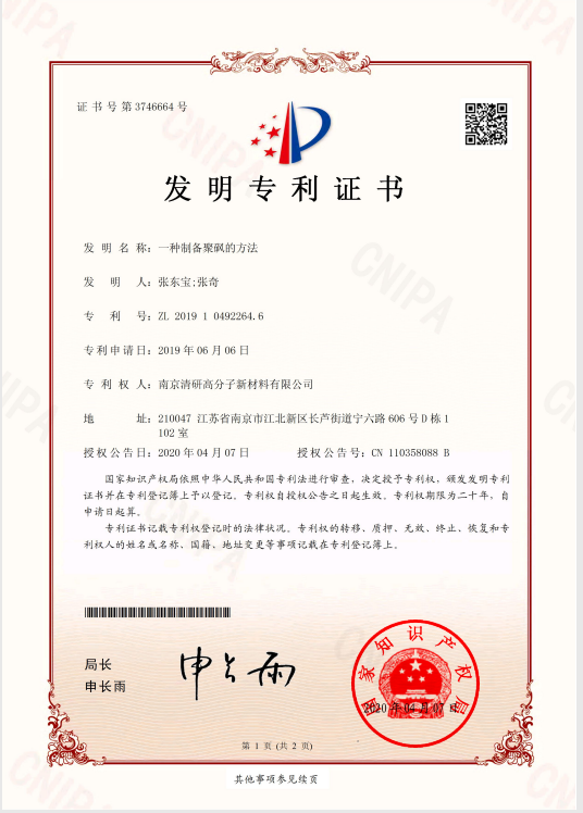 截至近日,我司及其全資子公司揚州清研高分子新材料有限公司申報的:“一種制備聚砜的方法” 專利號:ZL 2019 1 0492264.6,“一種制備聚醚醚酮樹脂的方法” 專利號:ZL 2019 1 0563187.9和“一種制備聚醚砜的方法” 專利號:ZL 2019 1 0506790.3共三項發(fā)明專利獲得國家知識產(chǎn)權(quán)局授權(quán)。此外,我司有六件實用新型專利獲得國家知識產(chǎn)權(quán)局授權(quán)。